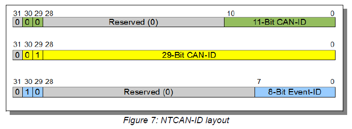 在下图中可以看到NTCAN-ID 32 bits的数据结构。其中黄色部分对应的是29-bit CAN-ID的数据格式。如果一个NTCAN-ID在第31 bit位和第30 bit位设为0,并且在第29 bit位上设为1的时候,后续的29 bits(从第28 bit位到第0 bit位)的数据会被NTCAN library识别为一个29-bit的CAN-ID。