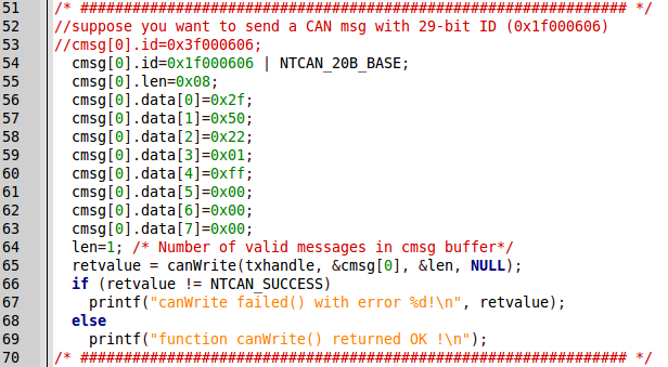 请参考tx_29bit_msg.c文件。假设应用程序要发送一个29-bit CAN-ID为0x1f000606的数据,CMSG内的id域设定需要用bit wise OR操作NTCAN_20B_BASE(定义在ntcan.h内),如0x1f000606 | NTCAN_20B_BASE。然后再用canWrite()函数将此CMSG数据发送出去,NTCAN library就会知道应用程序发送的是一个29-bit CAN-ID的数据。