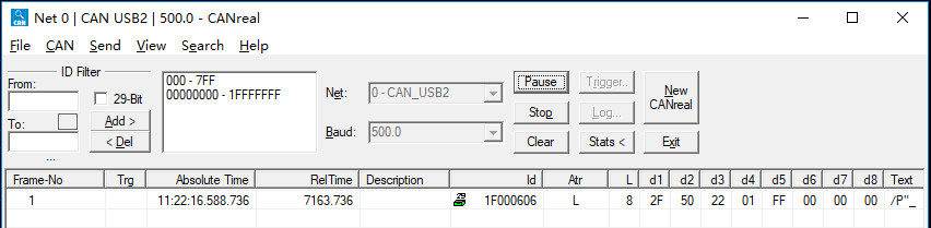 使用esd CANreal软件在CAN bus中发送CAN-ID范围在(0x1f000600 – 0x1f00060f)之间的CAN数据。在CANreal界面底部输入要发送的29-bit CAN-ID数据。