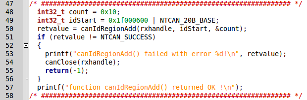 请参考rcv_29bit_msg.c文件。以下代码片段使用了canIdRegionAdd()函数,可以让CAN-ID范围为(0x1f000600 – 0x1f00060f)的数据传入应用程序。