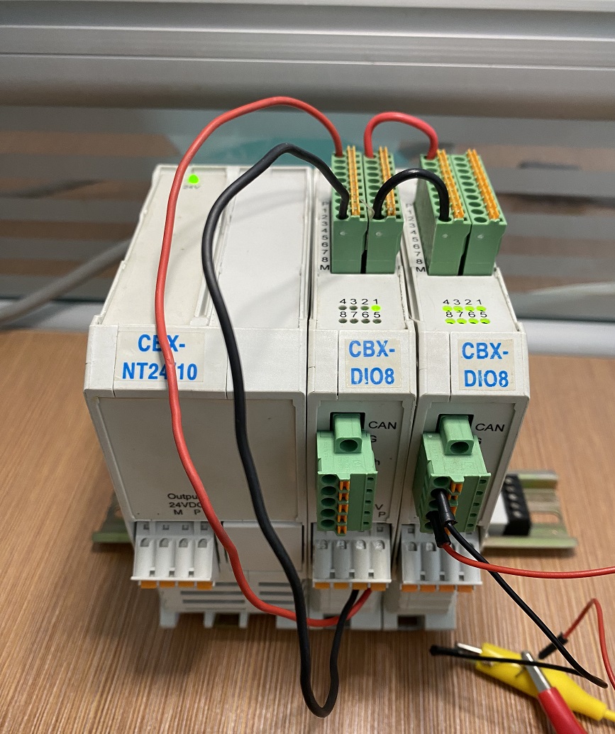 通过CANreal软件发送一条RPDO (ID: 0x211, Length: 2, Byte1: 0xFF, Byte2: 0x43),查看第一个DIO8,应该所有OUTPUT指示灯都亮了,第二个DIO8中第1,2,7的指示灯亮了。