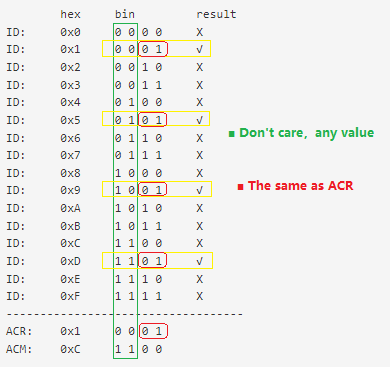- 如果ACM的某个bit位上设为1,则接收到的ID在此bit位上可以是任意值(不管是0还是1)。就是所谓的don't care condition。