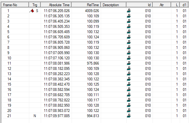 monitor CAN bus, capture CAN messages. 4.1 设定好接收的ID范围,Net No.和Baud rate后,点击Start按钮,可以开始抓取CAN消息。 4.2 使用COBview读取任意Object的值,在CANreal的Display Window for received Messages中会有相应的CAN消息出现。 4.3 Display Window for received Messages中的Rel Time是相对时间的意思,值的得到是用此CAN消息的Absolute Time减去上一个CAN消息的Absolute Time。 4.4 Display Window for received Messages中的Id栏位除了可以显示普通CAN消息的ID,也可以显示NTCAN Event消息的ID。 4.5 L栏位代表Length,范围0-8 4.6 d1-d8栏位代表CAN消息中8个字节的数据。