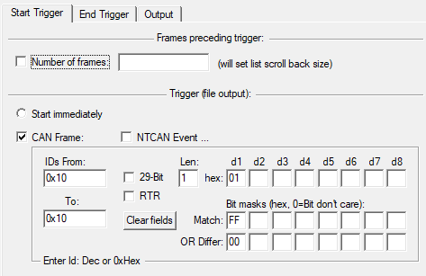 config start trigger and end trigger. 8.1 CAN->Trigger & Logging...打开配置触发启动Start Trigger和触发结束End Trigger界面。 8.2 收到特定CAN消息后触发抓取。 8.2.1 例如配置收到CAN消息ID为0x10,数据为01后,触发启动抓取logfile。参见下面图二输入数据。 8.2.2 同时配置抓取20条CAN消息后,触发结束抓取logfile。参见下面图三输入数据。点击"Start->"按钮后,CANreal底部出现"TRIG:WAITING"的字样。 8.2.3 在demo system的Linux PC上使用cantest工具发送一条CAN ID为0x10,数据为01的CAN消息(cantest 0 3 0x10 0x10 1 10 100 100 5000 0 1 0x10)。当CANreal收到此消息后,会触发启动抓取Logfile,请参见下面图四,Trg栏位中有面小红旗icon边上有字母S,代表此条CAN消息为触发启动的CAN消息,并且底部CANreal status栏位出现"TRIG:TRIGGERED"字样。 8.2.4 在demo system的Linux PC上使用cantest工具发送CAN ID为0x10,数据为01的CAN消息超过20条以后(cantest 0 3 0x10 0x10 1 10 100 100 5000 0 30 0x10),请参见下面图四,Trg栏位中在第21条记录处有个字母N的字样代表Number Of Messages触发了停止抓取logfile。并且底部CANreal status栏位有"TRIG:ENDED"字样。