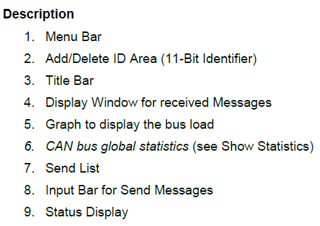 send list 6.1 在send list中添加记录。一种可以直接在send list中输入,另一种可以在Input Bar for Send Messages中输入后,点击Send按钮边上的小按钮存入send list中。 6.2 发送send list中CAN消息的方法 6.2.1 单发送send list中的一个消息,点击每条记录边上的send按钮即可。 6.2.2 单次发送send list中的所有消息,也就将send list中的所有消息发送一次的方法为,点击Single按钮即可。 6.2.3 循环发送send list中选定的消息,首先点击消息边上的off按钮使其变为on(cyclic栏位),然后在Cycle栏位中输入需要多少个cycle后发送一次,比如输入1000个cycle大致为1秒中发送一次。然后点击"Send list:" bar上的Send 按钮,就会每个1秒钟发送一次这条CAN消息。