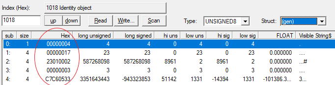 图五 Value of Object Index 1018 of CAN-CBX-DIO8 read by COBview