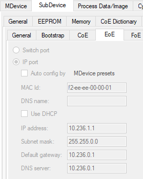 - In SubDevice->Mailbox->EoE, Select "IP Port", Uncheck "Use DHCP", set "IP address: 10.236.1.1 ; Subnet mask: 255.255.0.0 ; Default gateway: 10.236.0.1 ; DNS server: 10.236.0.1"